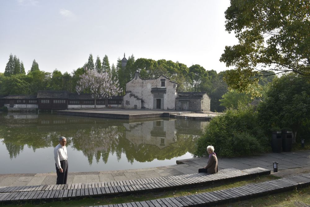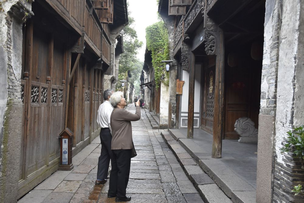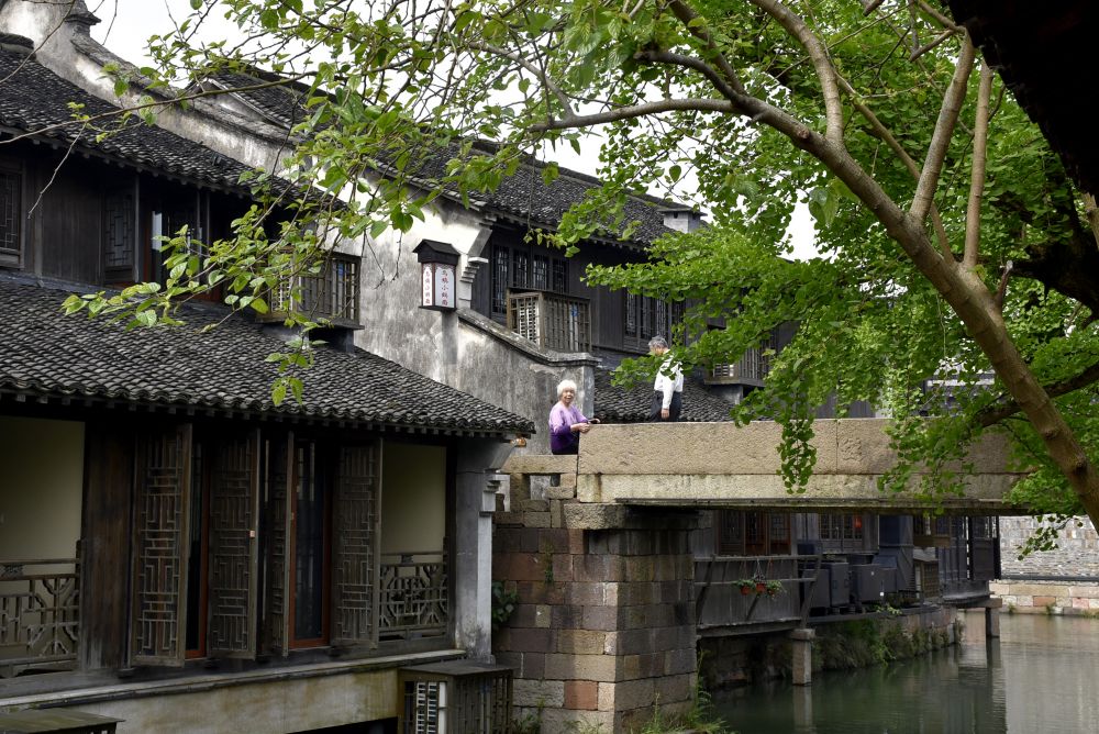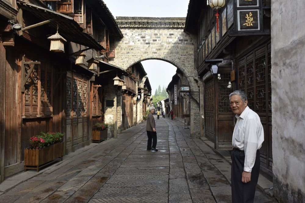我让父亲和母亲走在前面,一路照看着他们的背影。 父亲因为年前有轻微中风,行走的速度有些迟缓,以稳为重步步小心,我和母亲常常会故意放慢脚步等他。但是看得出来他们心情很愉悦祥和。乌镇的大小、环境和设施,很适合于行动不再矫健的老人,而且沿路都能找到随时歇脚的地方。我知道这一刻有我耐心地陪在他们身边,他们感觉很安全和完满。这样的情景给我带来安慰。