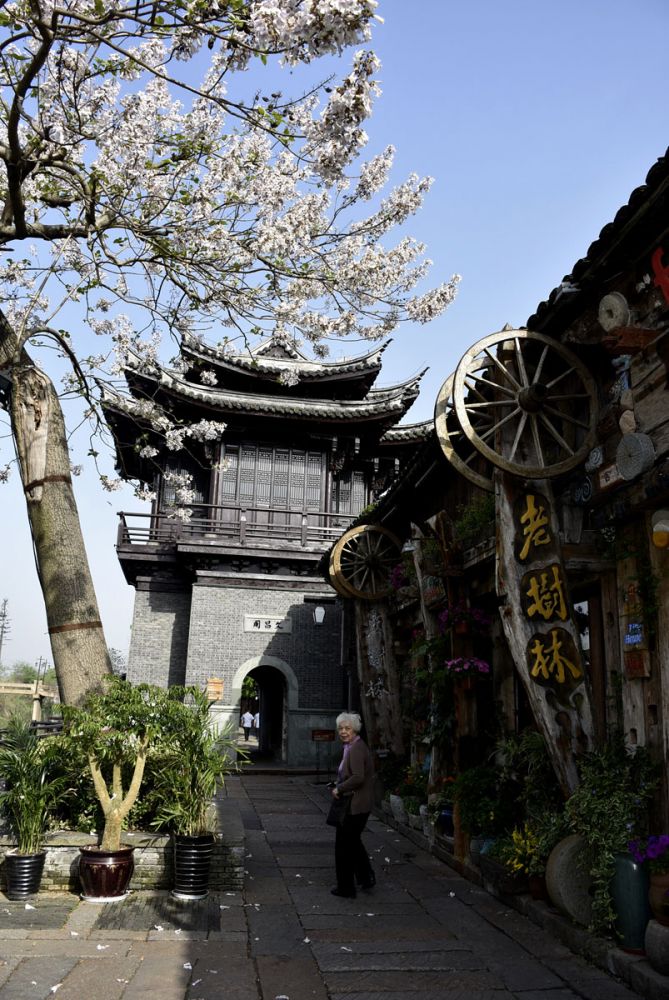 走到通济桥的时候,我和父亲坐在桥顶上让母亲给我们留影。那一刻暖色的阳光淡淡地照在脸上。父亲那天穿一件白色衬衫和深灰西裤,我穿着浅烟灰色的长袖连衣裙,背景是高耸的白莲塔。不远处文昌阁的前面,临水的高大泡桐树开了满树的粉色的花,景色如画,不似人间。通济桥下,房子便还是江南民居的式样,但是门外摆设的咖啡座以及栽种植物已非常西化,有一把把大的遮阳伞撑开。头一天的晚上路过,室内人头涌动,喧闹的现场摇滚声传出,艳光四射、烟雾迷漫。清晨里,玫瑰和矮牵牛在窗下面盛开,阳光明媚,反而是另外一种静谧的景象。