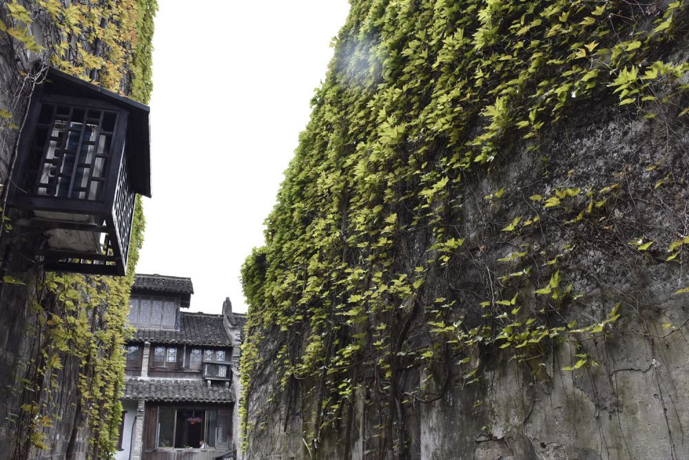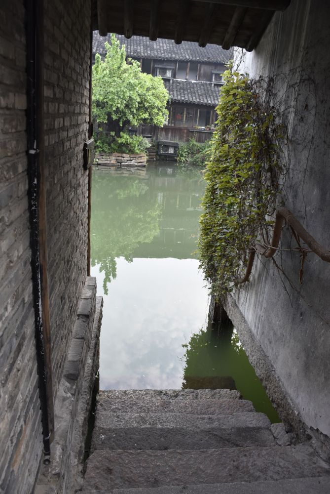 这是第一次拜访乌镇,住的是最西头的民宿、临水的二层木屋,木头颜色沉暗,质地上有岁月和南方天气侵蚀的痕迹。窗和门扇一律用回纹样式的棂花,白天都开敞着。黛瓦白墙,屋顶开有小小老虎窗。住的两间房间都有临水的窗户和阳台。在室内看得见左首边高高架起的小石桥(叫来远桥),还有桥边新绿的银杏树,郁郁葱葱。河水平缓,对面便是一个小码头,时有人声。白天和傍晚不时会有木船撑过来停靠。走出房子的大门,迎面空落小巷,贴着墙根摆放着几盆绿色小植物,在微风里轻微摇动着叶子。每日用餐我们会回到自己住的民宿里点菜。店里伙计很友善,厨房里做的都是家常菜,亦有新鲜的河虾和当季野菜,价格合理,有一点点家的感觉。