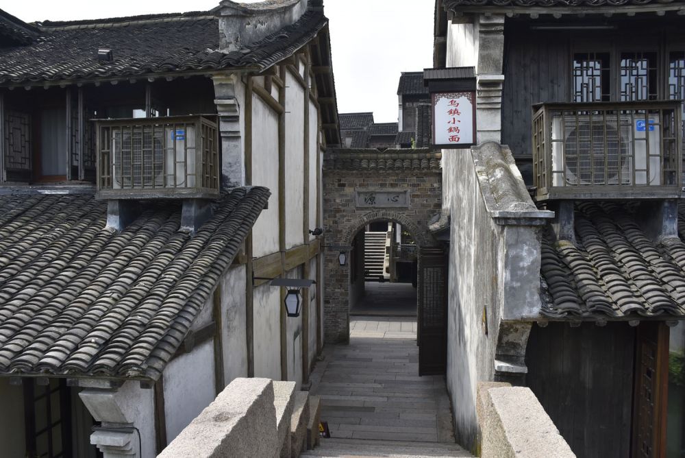 从南岸向东再折去北岸向西,在游人甚少的清晨,一路走走停停,兜一圈会需要两个小时。走到到昭明书院一带的西栅大街的时候,天色已逐渐逐渐地变得透亮清楚,缕缕阳光从微彤的云层里洒下,慢慢漫延、拨开天际,进入街道里。周围开始有了寥寥几个其他的行人和早起的清洁工人。那一刻会意识到乌镇开始苏醒了。街边房子的木门板却都还关着。路过旧时有钱的大户人家或祠堂,抬头可以欣赏到门楣和窗户上精美的木雕,没有过往人流打扰。