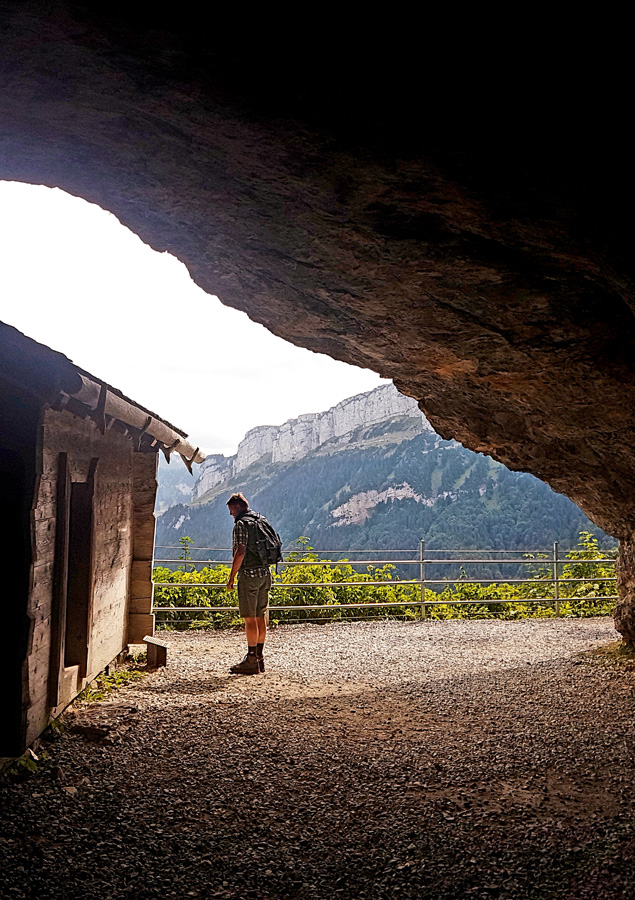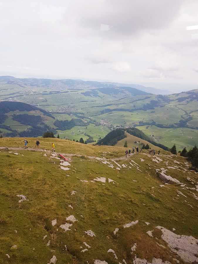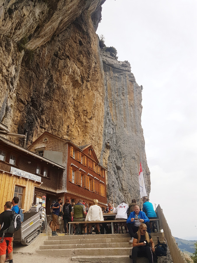 缆车把我们包在一个大大的玻璃盒子里,缓缓地带向高处。周围景物退向脚下,山峦丘林,一点点变得渺小低矮,然后我们就到了。看见稀稀拉拉有游人沿着小路下山去往洞穴教堂和Aescher客栈,我很快也加入了他们的行列。