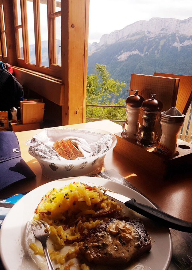 山回路转,Aescher客栈的木屋子呈现在眼前的时候,虽然有惊鸿一瞥的开心,却也看到了密集的游人,把客栈外的天台都占满了,还有分散在周边岩石上野餐的背包客们。风景是一样的,味道却不一样了。而我自己,在附近观看了风景、拍过照片之后,也像其他俗人一样,一头扎进那客栈,找了个门边看得见风景的角落坐下,点了一个大大的猪排加煎土豆丝(Rösti)套餐,据说是他们的招牌菜。一边大吃大喝,一边欣赏门外的群山。不时有游客经过探头进来查找座位,对面的一桌父子们喝着啤酒在打牌。整个客栈的室内也是木头建造,层高低低的,气氛特别温暖。山风斜斜地吹进来带进清爽的凉意,太阳终于穿透云层普照万物。酒足饭饱之后,我靠在木椅上伸直了腿发呆,居然有些昏昏欲睡,心里渐渐升起一种幸福感。这样隐居山间,过过简单寂寞的修士日子,可能真不错,只是清静,却已经谈不上了。