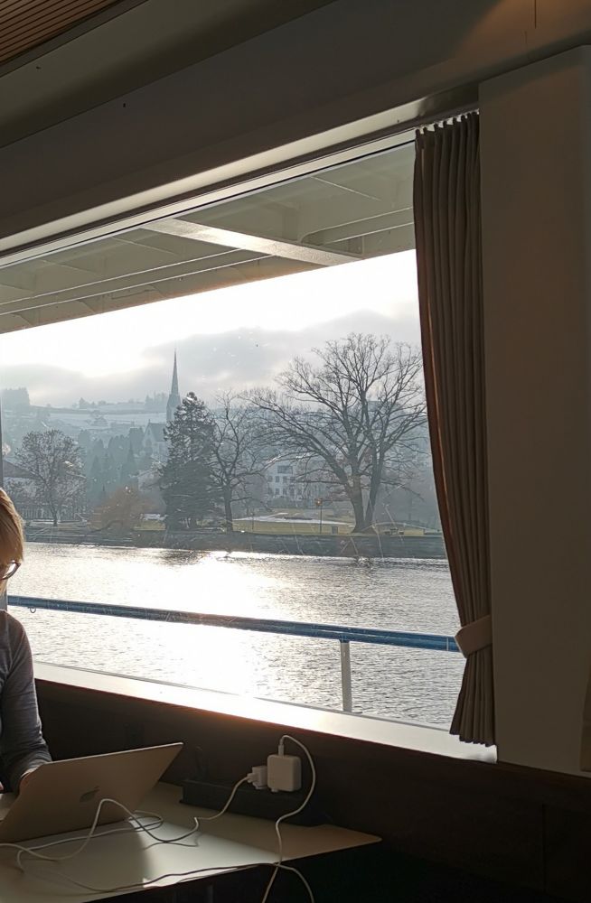 船上有苏黎世州银行的工作人员打了招牌迎接象我这样在网上登记了参加他们的“湖上办公室”活动的人。新年伊始,苏黎世州银行客服部的市场经理突发奇想,选定了三个日子包下轮渡一半的餐馆空间,为 “苏黎世办公空间”俱乐部的成员提供四小时的办公环境。也就是说,报名参加的会员,只要手持一张普通船票,就可以在这个办公环境里一边环游苏黎世湖两岸风景、一边办公、一边享用免费咖啡和简单茶点。