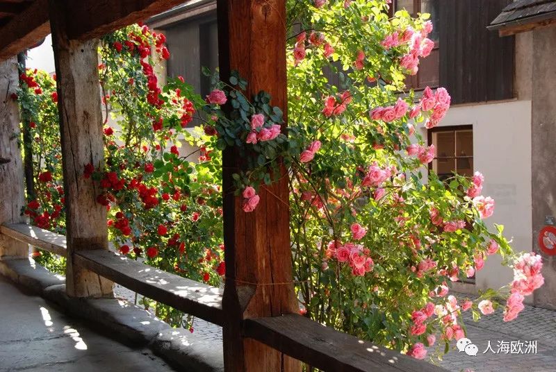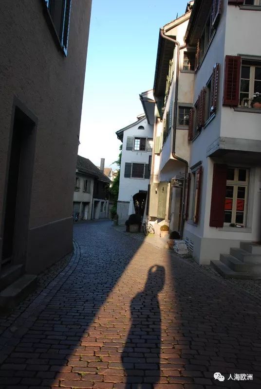 接近八点的时候阳光才姗姗洒进窄窄的老街。我在Hintergasse里徘徊。也步入低矮的街廊里去取景。从那里看出去,整个外面的世界都是浪漫的玫瑰色。那一刻我突然明白, 仅是这点,就会让我对瑞士产生乡愁。