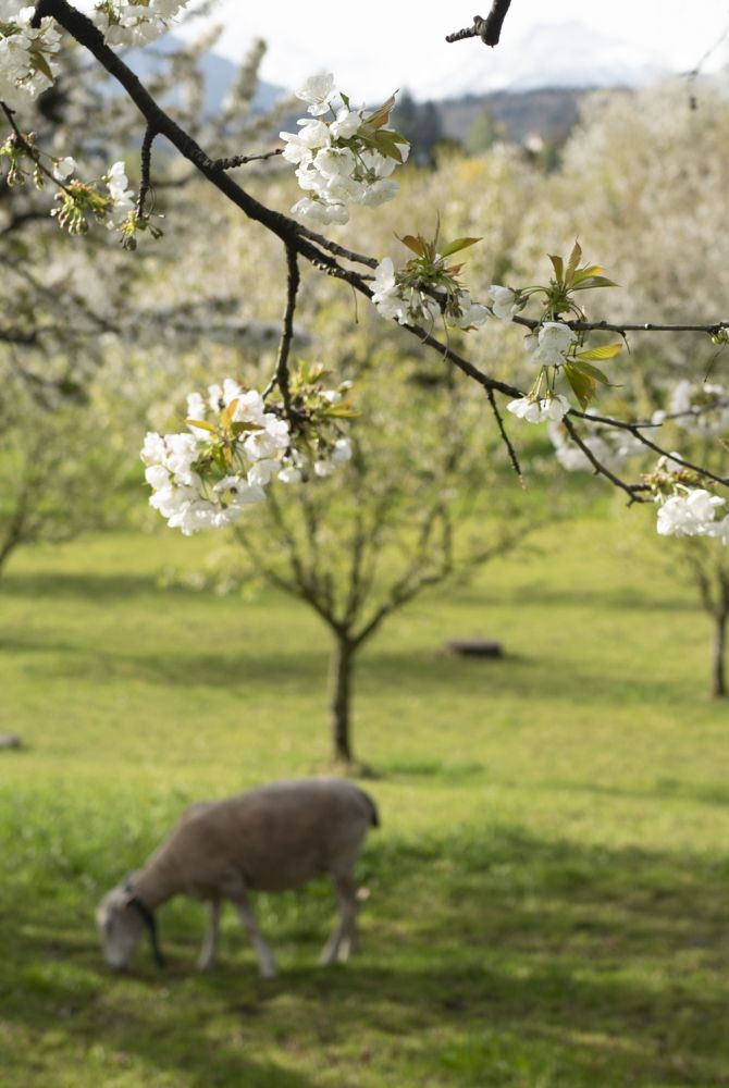 走入樱花林的经历是美妙的,脚步轻盈,头上的一片天被干净的繁花遮盖……入眼全是一簇簇从树枝上挂下来在风中颤动的粉嫩花朵,精致的花瓣和花心在清晨的阳光光线中有透明的质感、淡淡阴影如同意乱情迷……一路走,一路看,一路抚摸路过的花枝,不知觉身前、身后、身左、身右被不见边界的樱花树林围绕。不见山,不见水,不见古堡,不见人迹。只见樱花、绿色草地、深色树影和散落在草地上低头默默吃草的羊群。