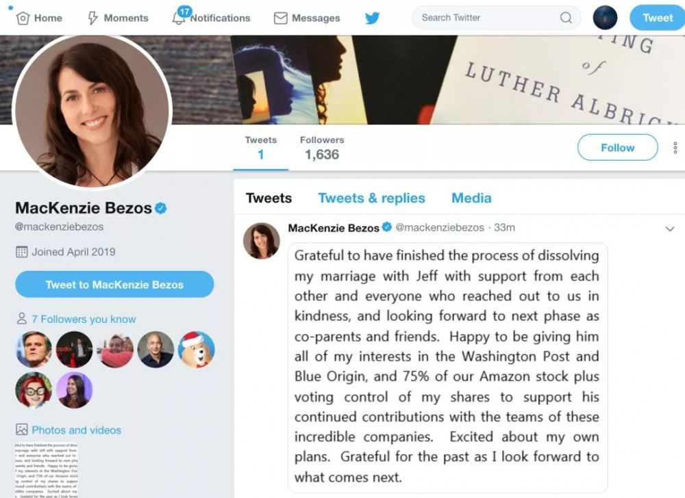 今天一早起来,坐在餐桌前边喝咖啡边看社交网上的新闻。世界首富杰夫·贝索斯与前妻麦肯齐·贝佐斯已经办完了离婚手续,麦肯齐·贝佐斯在Twitter上简短声明: