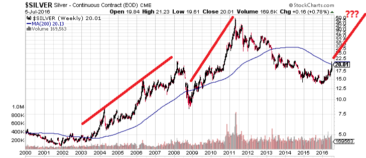 白银价格也迫近了200周线,上两次破线后银价都翻了大约4倍:
