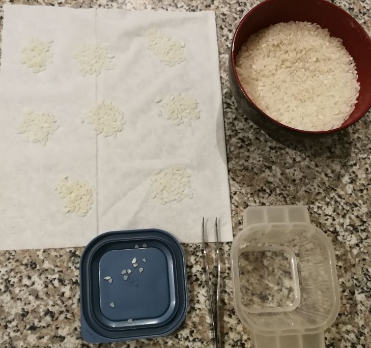 现在开始捡米,400粒。目测半粒的都挑出来。每50粒为一堆。这个很辛苦,因为老婆在旁边看到了,主动帮我数:26, 27, 28, 29, 40, 41, 42,,,前后数了大约600粒,但能用的就400粒。