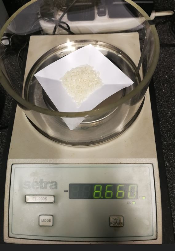 好了,干正事,把米带到实验室,这个秤的最小显示是1毫克,误差:正负2毫克。