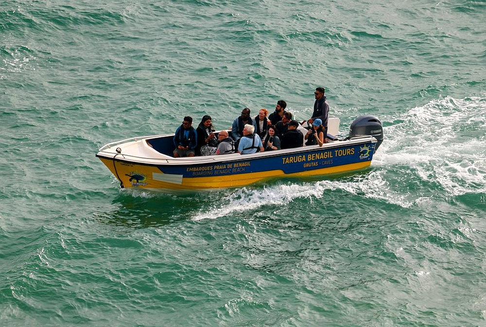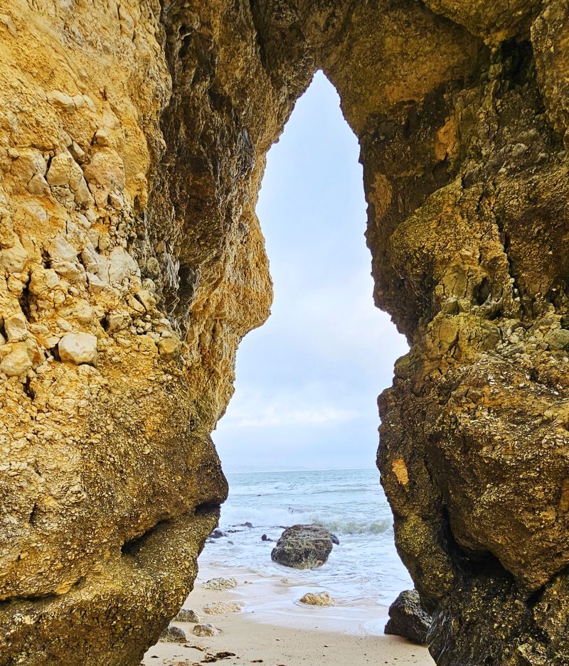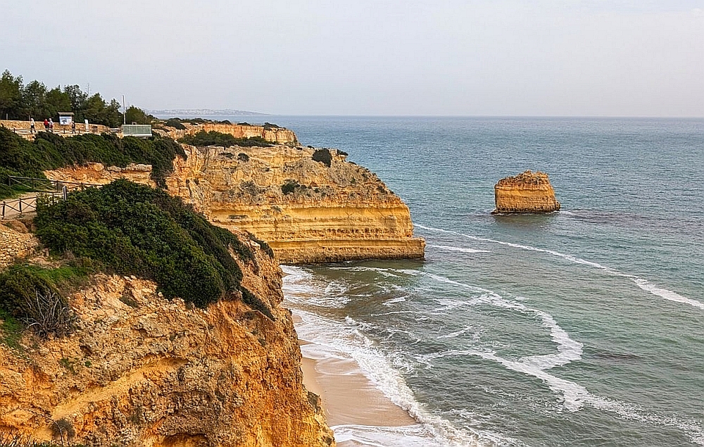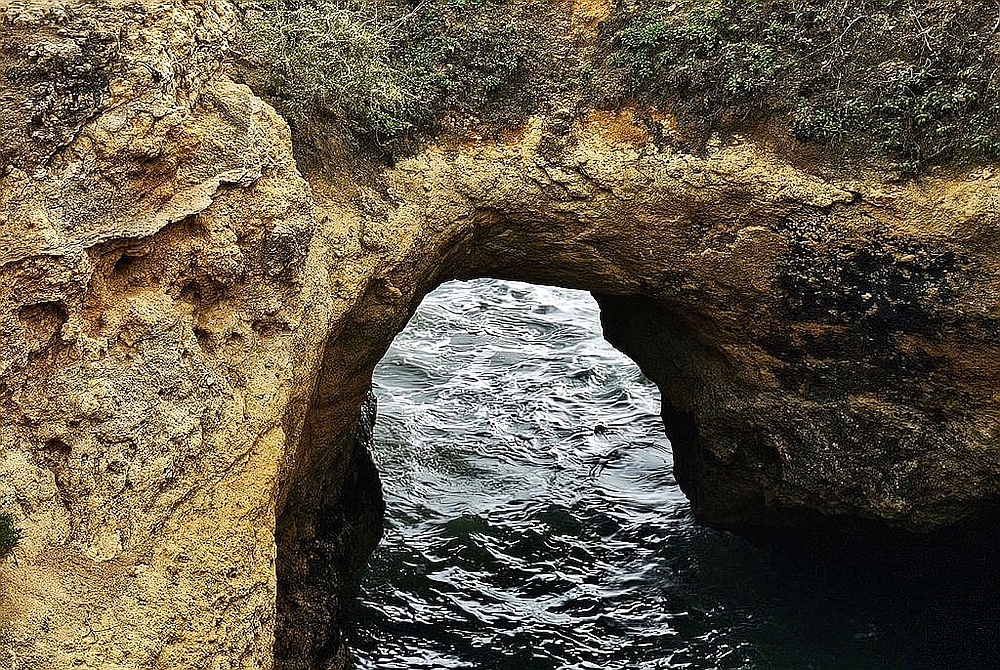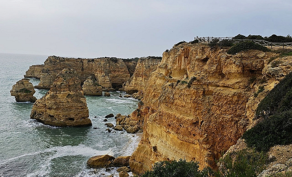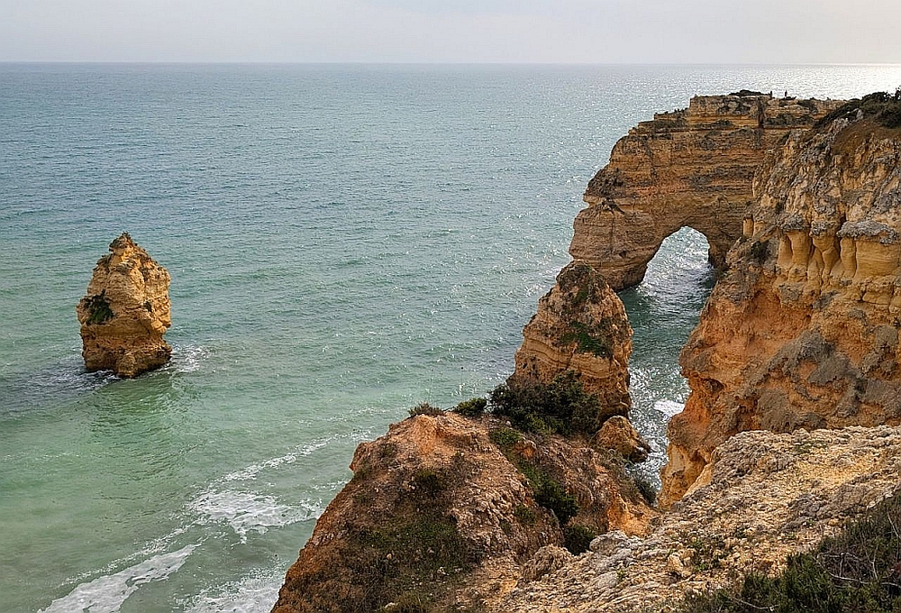 早上就在旅馆对面长途公交站乘大巴,去葡萄牙Faro,票价大约20欧元。塞维利亚车站很大,同时发车去很多地方。在Faro机场下车后,到Sixt取了车,为了走缴费公路,我们还租了电子计费tag。一路高速,开到了葡萄牙的南部海岸线拉戈阿Lagoa地区。拉戈阿属于葡萄牙南方阿尔加维大区,这一带海岸线以风景如画的石灰岩洞穴和海边石窟而闻名,黄色的峭壁岩石, 形状奇特,在碧蓝的大海衬托下,分外好看。我称之为葡萄牙的黄金海岸。因为其颜色,也因为这一带是世界上最被推崇的度假地之一。在免费的停车场停好车后,就按着步道指示,走到海边,从Marinha Beach沿着海边的步道(七悬崖步道)走到Benagil海蚀洞。一路都是石头被海水蚀刻形成的桥、洞、柱和各种形状的石像。