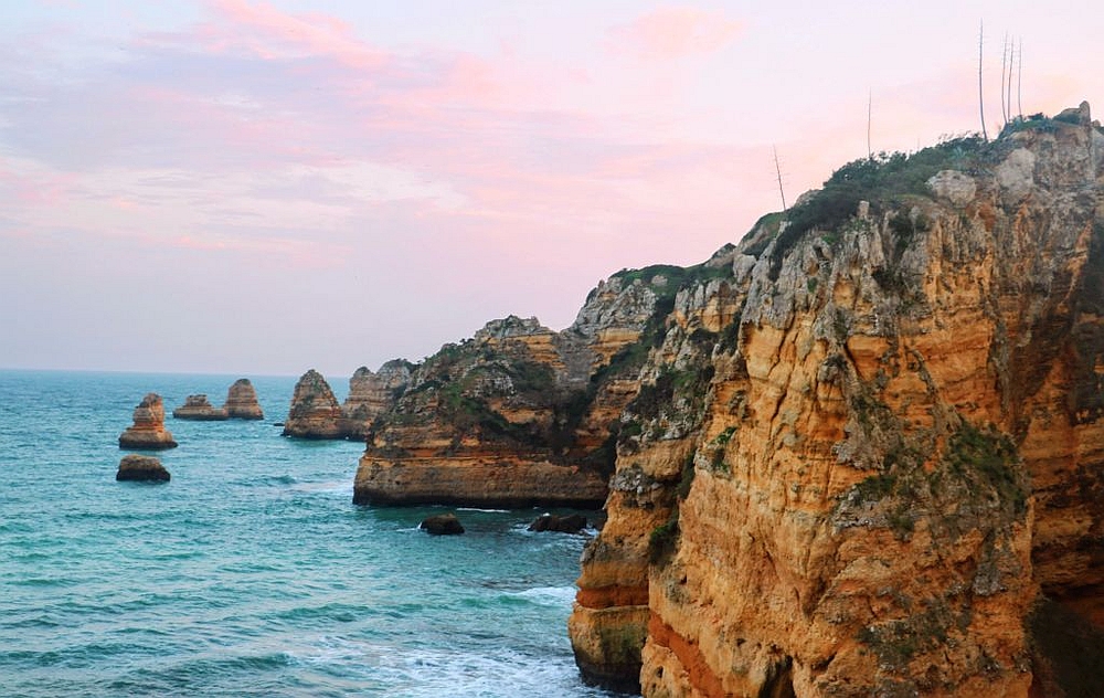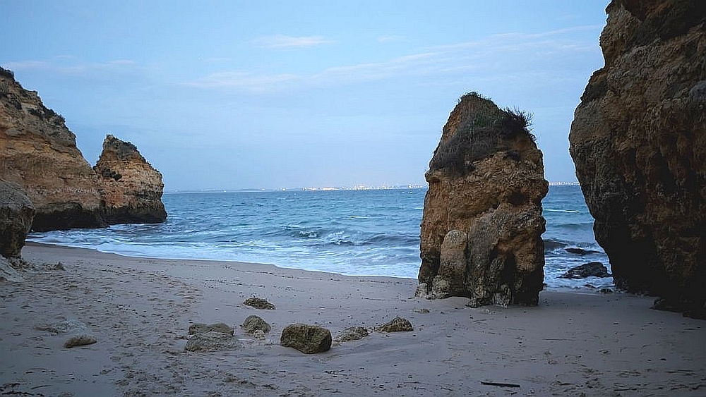 接着开到今天的旅馆Cascade Wellness Resort,这个旅馆就在海边,五星级,条件很好。安顿好之后,就开车去附近的几个海滩。Lagos是一个伸向大西洋的尖角。角的东边有几个海滩:从南往北分别是Camilo、Dona Ana、Pinhao。我们把车停在Dona Ana的停车场,从台阶走下海滩,走了一会儿,天就黑了。决定明天再来。