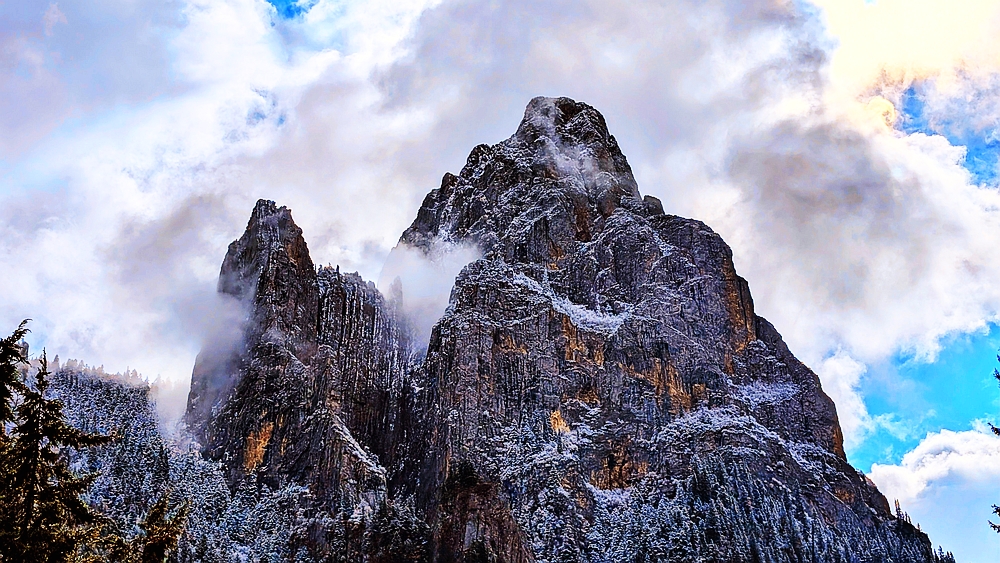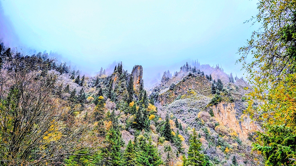 次日,醒来看见窗外仍是云雾飘渺只见半山。天气预报说10点后会晴。我们于是先去进山徒步。走到游客中心,在这里乘小巴上山。小巴很豪华,来回40元,上山游客不多,成为我们的专车。一线天再往前,是神王庙和石林。神王庙就是一座简陋的庙。这一路距离远,要乘SUV或租马,走路来回至少3小时。我们选择在一线天附近玩。云雾还没有散。一线天是一个狭窄的峡谷。这一带周围都是高耸的山峰。昨晚山上下雪,山顶都是白的,树冠戴雪,加上云雾缭绕,别有一番姿韵,风景很像中国山水画。