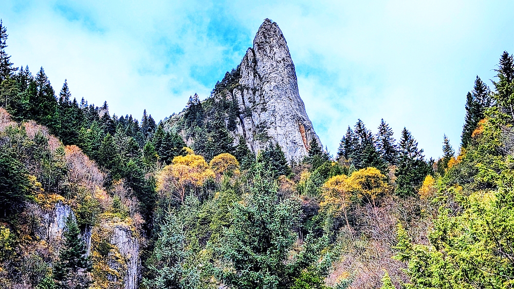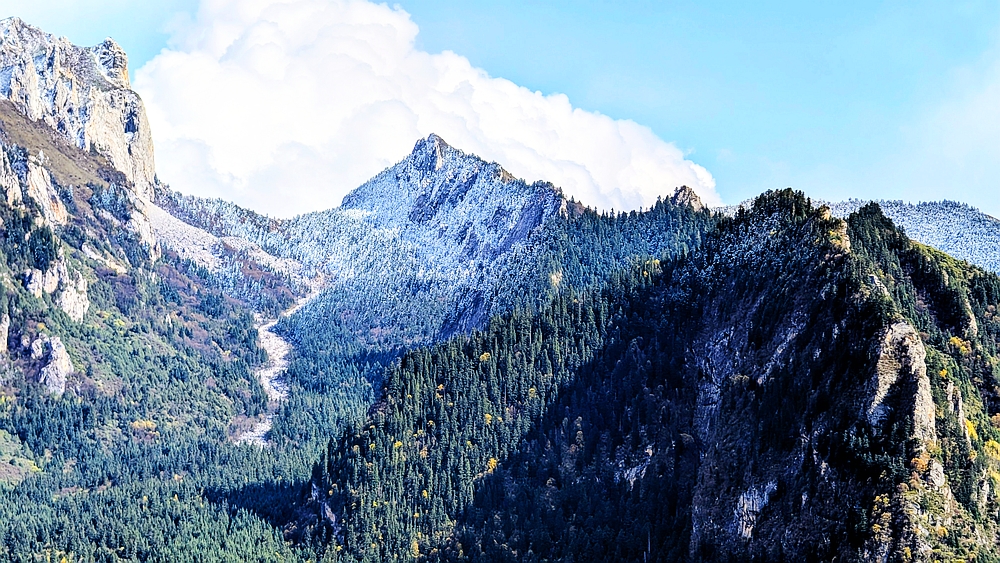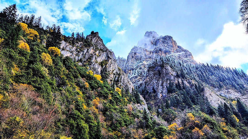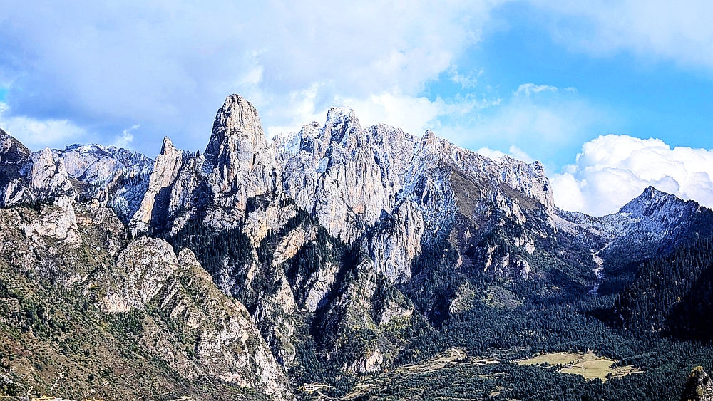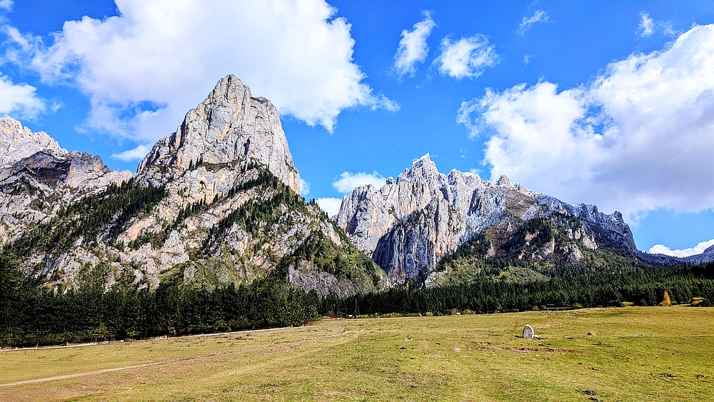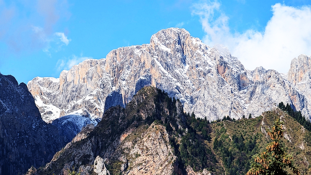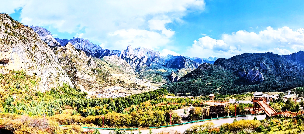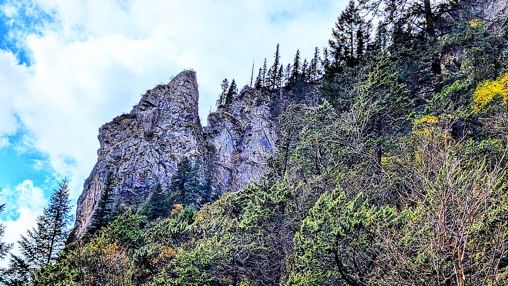 从一线天坐返程车到老虎嘴,再走路到仙女滩。仙女滩座落在半山,是一个观景平台。可以360度观赏扎尕那的山景。这时天晴雾散,扎尕那山景清晰可见。这里是看扎尕那奇山峻岭的最佳地点。