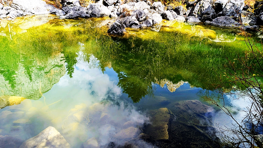 仙女滩到仙女湖一路上坡,走到跟前,是一小水坑,颇为不值。水坑虽小,一湾碧水,倒影清晰。