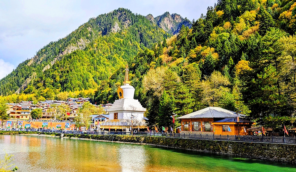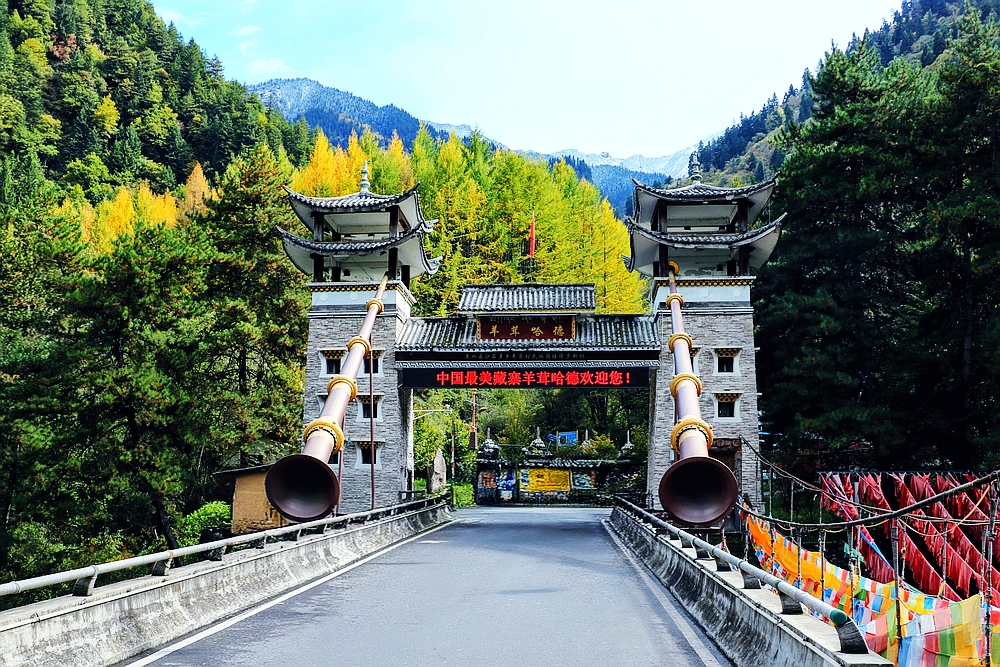 奶子沟沿路的可停车景点并不多。洛哩错是一个,这里有个靠山湖,山上有彩林。羊茸哈德是一个藏民村寨,这里有彩色立体的藏式民居和吊桥。七彩甲足也是一个藏寨。