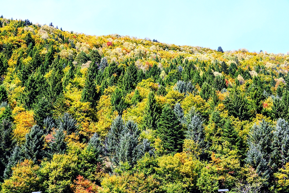 奶子沟的彩林有点儿让人失望,颜色不够浓烈,面积不够大片。是被过度宣传的景点。不能太相信媒体、小红书和网红的宣传,言过其实成分太多。当地人说因为今年是闰六月年,延迟了树叶变红黄的日期。我不太相信这种说法,草木的生长周期主要是根据地球对太阳的公转决定的四季气候决定的,而与月亮决定的农历无关。再说枫树已经变红了。而有些树都已经落叶了。可能今年的气候和雨水导致了彩林的树叶不变色就掉了。