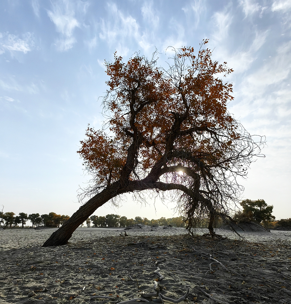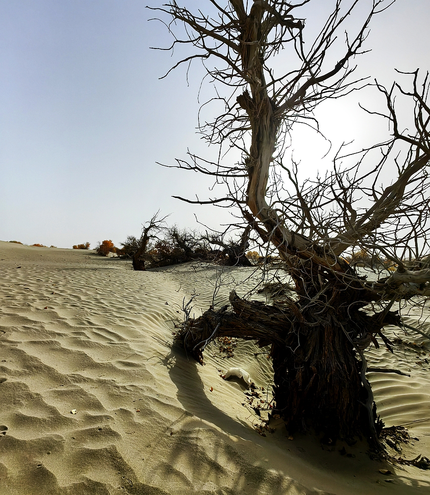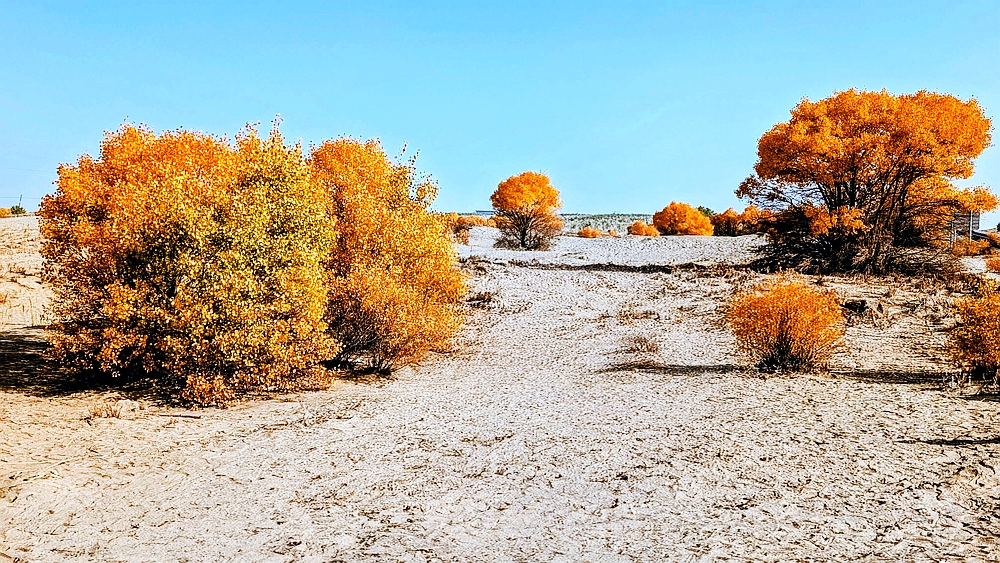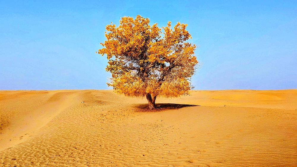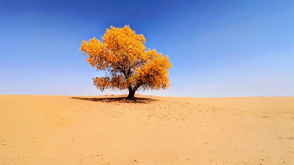 沙漠上的公路笔直。除了大漠风光,不时可看见胡杨林,更好看的是大漠孤树,蓝天黄叶。