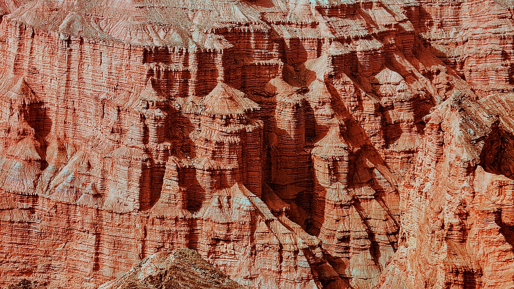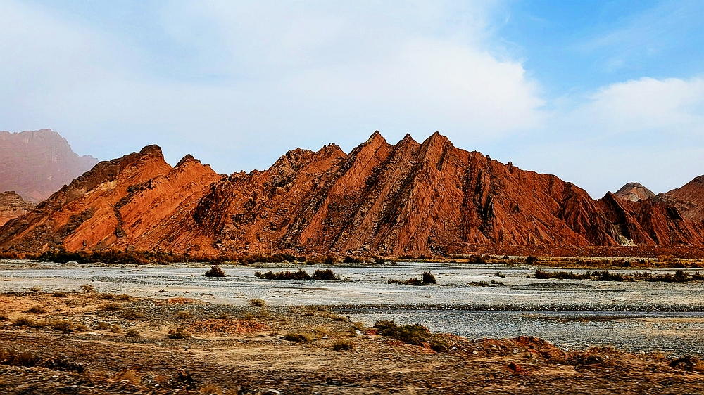 时间有限,没走完139公里的全部秘境公路,司机中途往北去了库车,错过了东端的沙雁洲。包车不如自驾,行程不能自己掌握。从库车经独库公路南段,去天山神秘大峡谷。盐水沟隧道前的停车场有观景台。周围的山形都很有特色。寸草不生,皱褶明显,层次分明,颜色各异。有一处凸凹有致,被命名为布达拉宫。