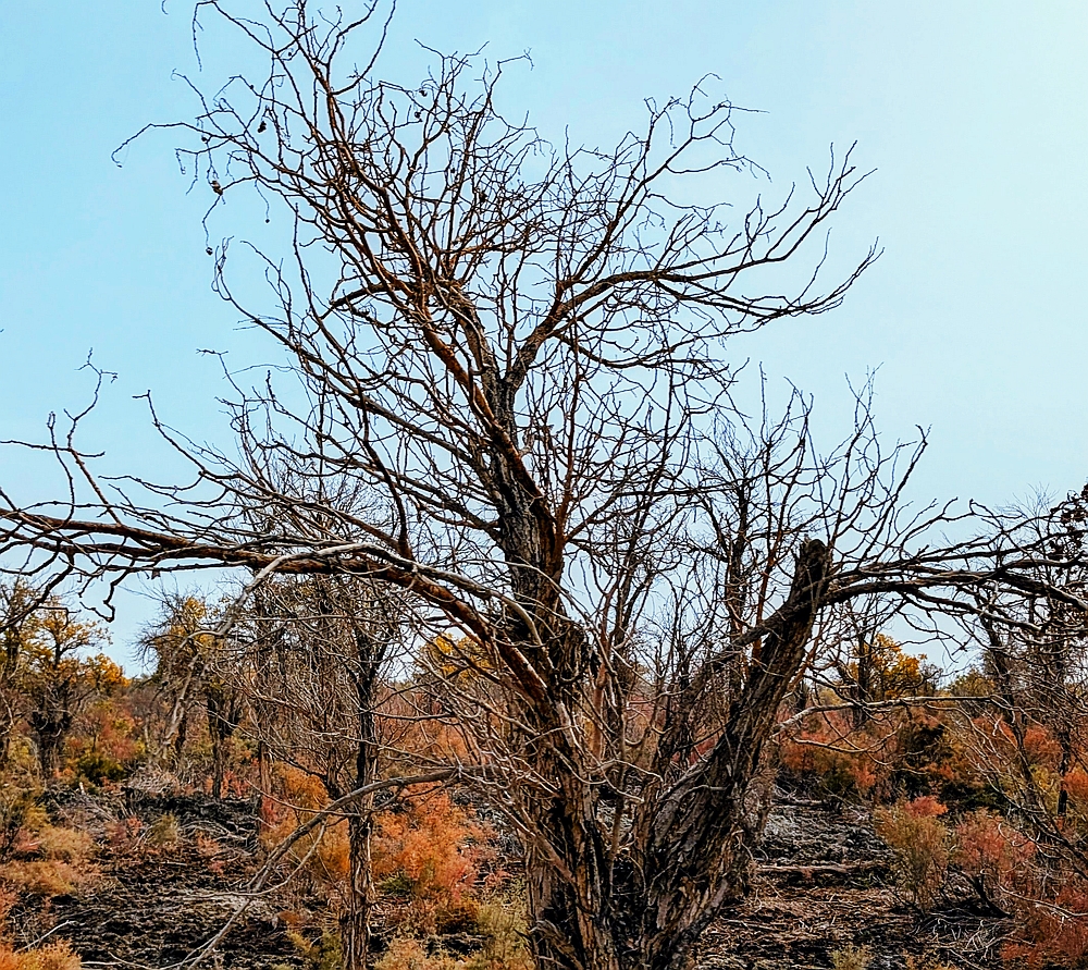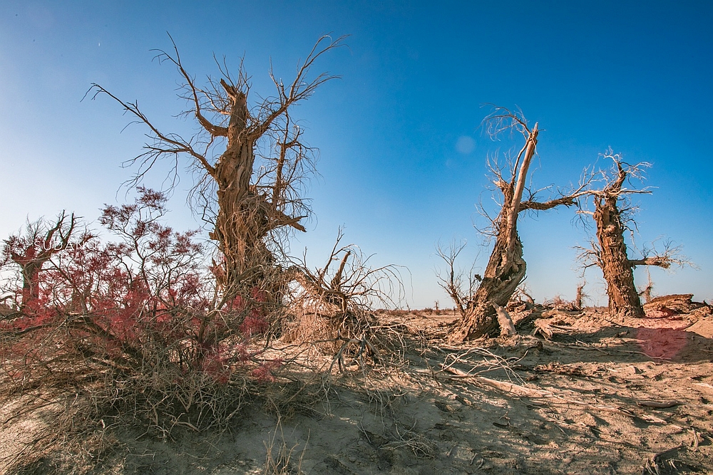 距入口不远是魔鬼林。许多死去但仍然挺立的胡杨林,其枝干张扬,乱舞在空中,宛若群魔乱舞。表现了胡杨林千年不死,死而千年不倒的顽强。