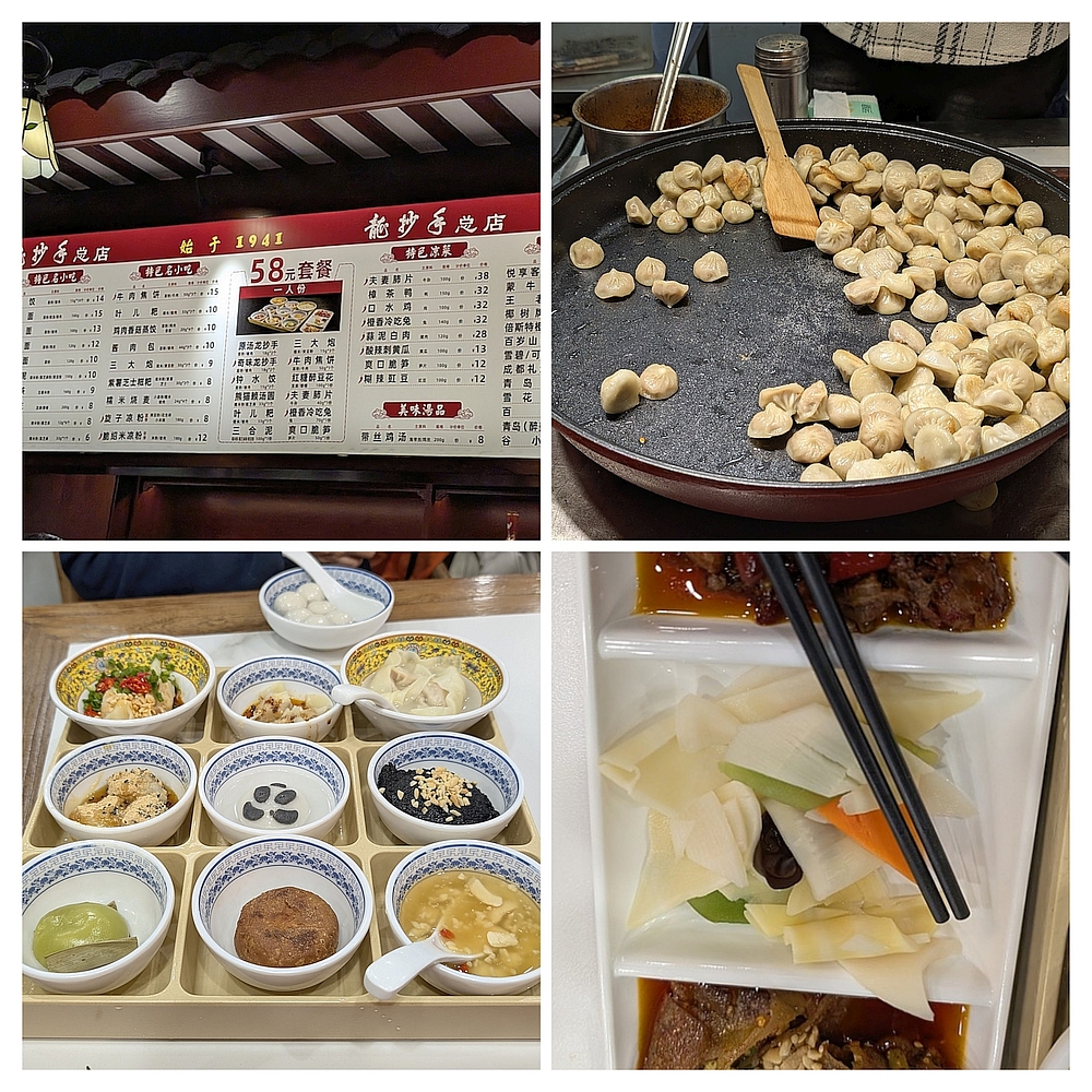 到龙抄手总店,点了58元套餐,12样小吃都尝了。下一顿吃什么? 成都人不知为什么专和兔子过不去,满城都在吃兔。试了试成都人最喜欢的兔头,不难吃,也不美味。主要是啃了半天没什么肉。看见王妈手撕兔店很多人排队,也买了一份,尝了尝,实在不喜欢,把兔子肉撕碎了和干果、辣椒混在一起,加大量油,这种吃法不敢恭维。翻来翻去,沙里淘金般的找肉吃。肉又硬得很,还带着骨头,到处流油。吃相既不雅观,也很狼狈。这只兔子,带到北京,吃了三天,没有吃完。扔了一大半。第二天,去陶德砂锅吃饭,点了香辣烤鱼、黄焖猪蹄和素三鲜,糯米糍粑。人均49元,真不贵。但川菜重味、重辣、重油,掩盖食材原味。还伤食欲和味觉。到了晚饭,春熙路乱走,看到什么都不想吃,最后再回龙抄手老店,吃了一碗小面和一碗甜水面。