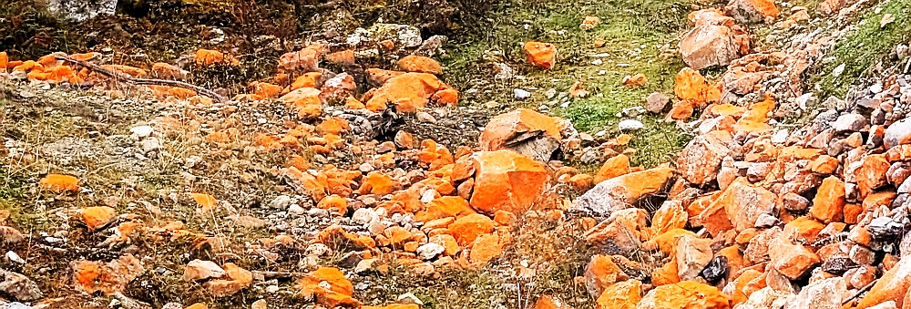 理小路上有红石滩。这里的石头,好像被染上一种很奇特的红色。据说因为这种石头含有一种矿物质,被一种红色的真菌喜爱。