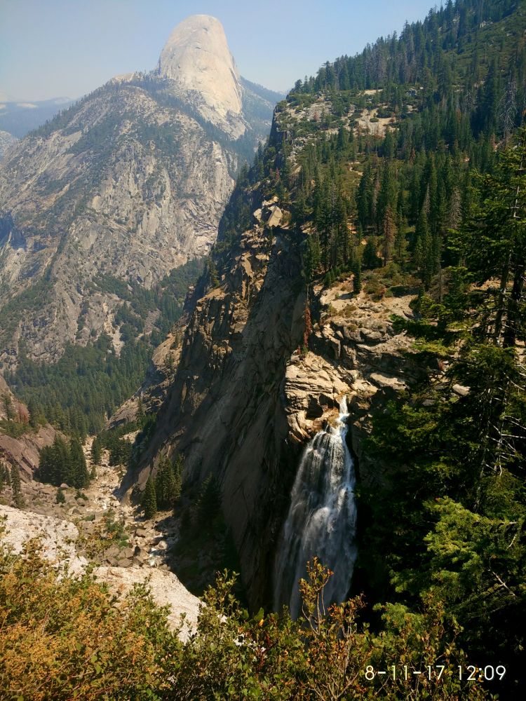 下午吃过午饭,睡了一会午觉才骑车去的Vernal Fall Trail. 这是Yosemite最好的人最多的hiking trail。 Vernal瀑布的雾气很重,旁边有彩虹。有些陡,上边的源头有一些人在游泳。