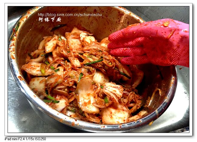 1.大白菜也可以整棵的腌.先把白菜切一半,头部再切一小段,用盐水泡腌软后漂洗几次,挤干水,然后将做好的调料一层层抹到每片白菜叶上面。我比较喜欢切块腌,方便取食。