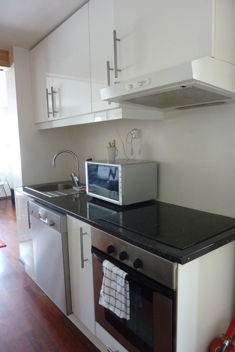 7. Just off the entrance was the kitchen. There were some pots and pans, dishes, cups, silverware to use. Some oil, salt, oats, popcorn, foil ... were in the cupboard, probably from people living here before.