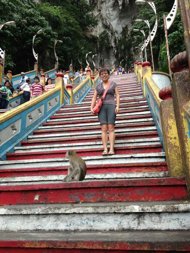 There were a lot of monkeys at the stairs, stealing food from people. They looked really mean. I had a bottle of water in my hand. This big monkey grabbed it out of my hand from behind so suddenly that I almost lost my balance. And it twisted the cap off, laid the bottle on its side so the water poured out, so it could drink the water right in front of me.