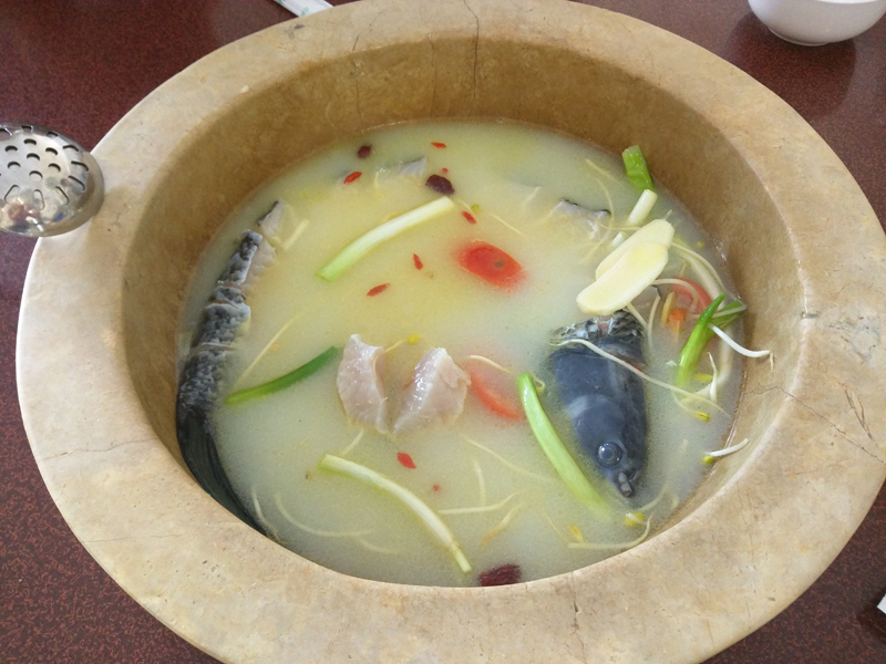 We had stone pot fish. It is like hot pot with fish. You eat fish first, and then boil other stuff like tofu, vegetables, rice noodle etc. in the soup. It was delicious, and all for 153 RMB (~$22).