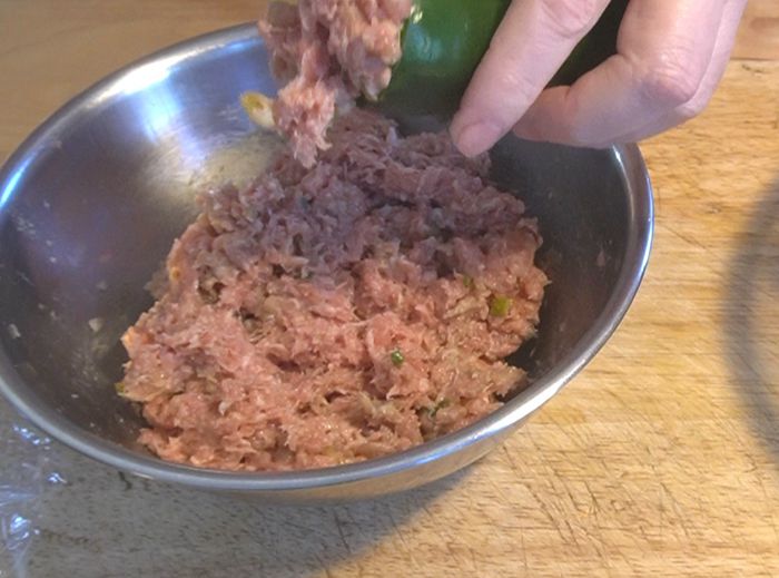 肉末按自己的口味加鸡蛋葱酱油盐糖,调制好 把肉末塞进辣椒里面