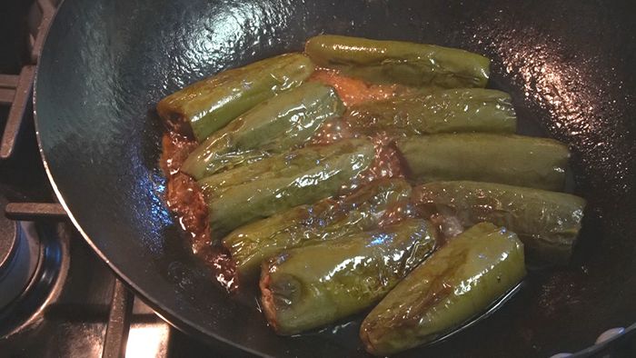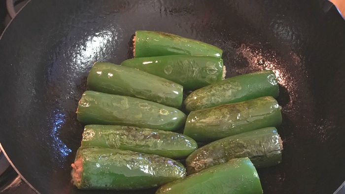 加1杯水+2大勺酱油+0.5大勺醋+1大勺糖 煮开后,大火收汁 香辣甜酸的辣椒塞肉就做好了