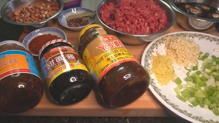 牛肉碎 辣椒粉 八角香叶花椒 花生 香菇 葱姜蒜 辣豆瓣酱 甜面酱 黄豆酱