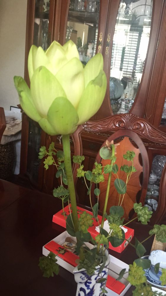 荷花香消玉殒了,望着荷去空空, 今晨在后园中折来一枝青藤, 插一盆青蔓盆景, 似听到风中荷传送来的声音.....