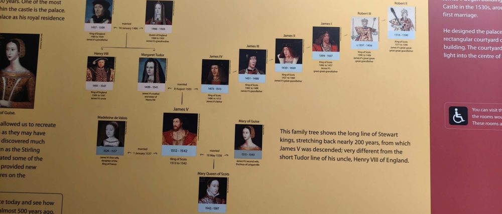 去年在德比郡参观哈德威克庄园 (Hardwick)的时候,知道苏格兰玛丽女王曾经在这个庄园幽禁居住过,这次在斯特灵城堡看见了苏格兰皇室的家庭树,比较直观地读懂了苏格兰与英格兰皇室的来龙去脉。