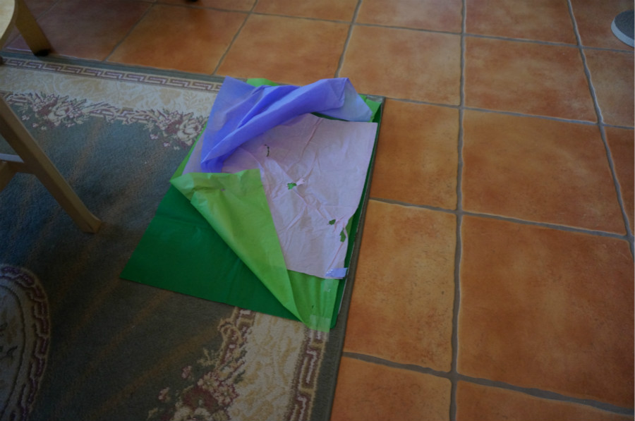 所谓加强版就是所有的彩纸都用胶纸粘在一起了,然后再被粘在地毯上。老妈心想这下能坚持一阵子了吧?