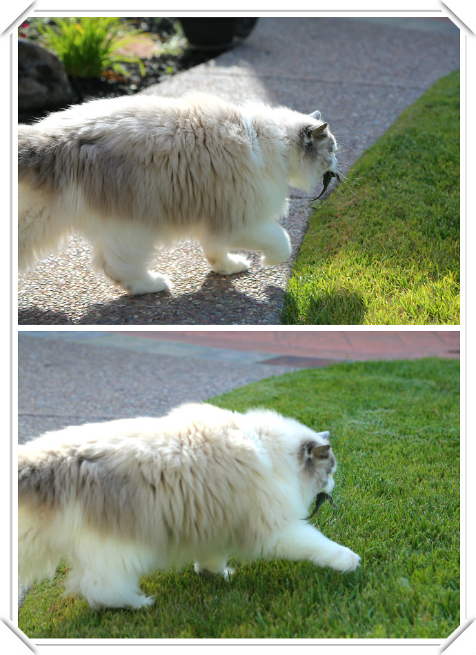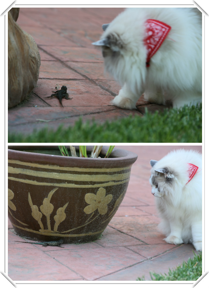 不过昨天,公主终于雪耻了!她又抓到一条大四脚蛇,这次没有让它溜走,公主玩得很high,在贝儿弟面前挣足了面子。而且因为正赶上老爸拿着大炮筒,公主戏蛇的过程被抓拍到大量精彩高清图片!这是其中三张: