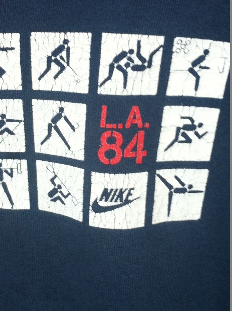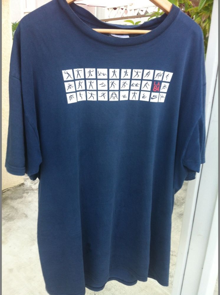 我才意识到,我穿的一件1984那年洛杉矶奥运会闭幕式的T恤。,差不多三十年过去了,这在T恤衫类里面应该算是古董了吧,不过我这类T恤多了去了:奥运会的、全运会的、青运会的、大运会的、世界杯的、世锦赛的、赞助商的一大堆。我从来也没有刻意穿哪件也没有刻意不穿哪件,反正平时是抽到哪件就穿哪件,因此,虽然这件T恤已经快三十年了,但是实际上穿的次数不多估计就像穿了一两年的样子。