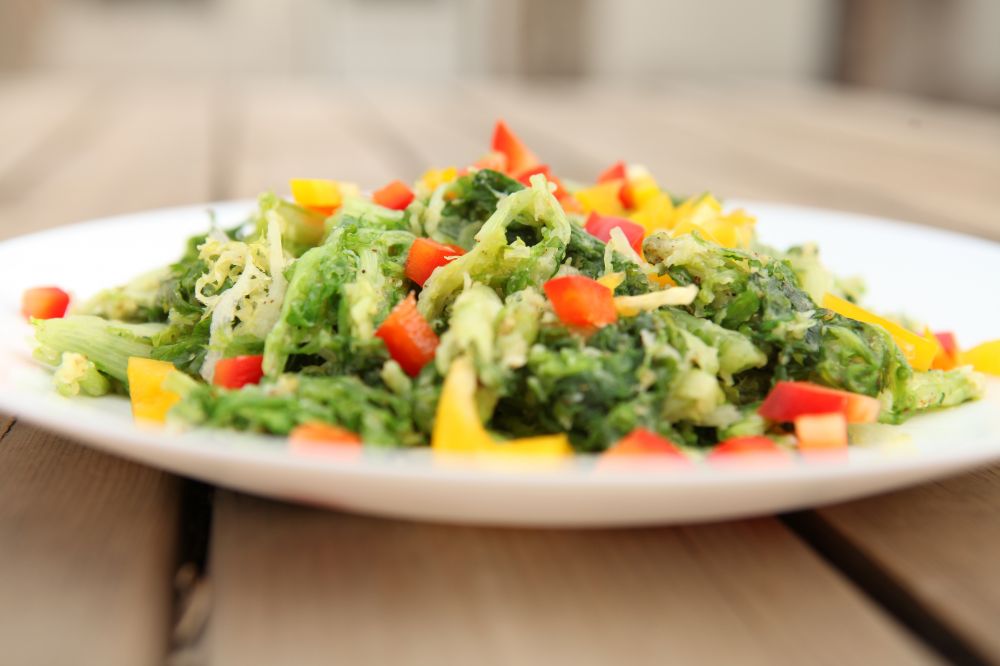 原料:苦苣,面粉,红色和黄色的彩椒(最后的装饰用)