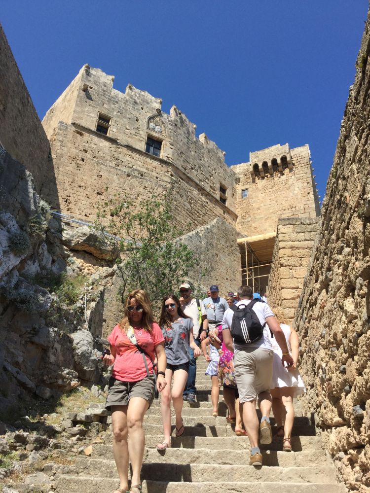 太太有点恐高,到了林都城堡城门口,便不愿再往上攀,独自在骑驴队伍那块儿等大家。花十二欧元的门票价,我们一行五人,穿过一人把关万夫莫及的石级进入城堡。
