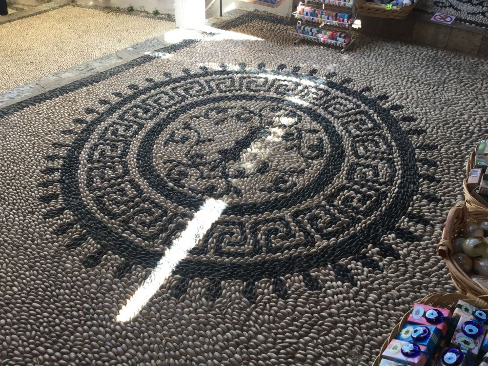 下山顺便逛店,就在朋友排队上厕所的当儿,我们欣赏着小街路面的装饰。本色与黑色鹅卵石铺就的地面十分有特色,好看还不滑。心想以后建房时,依样画葫芦,在庭院内也修条鹅卵石小径。