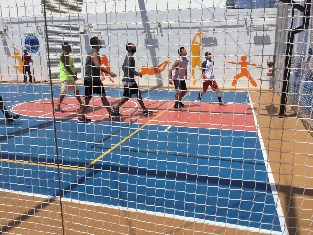 甲板上,运动场已经热闹非凡,我闯进篮球场,也想试试身手。一位邮船工作人员却要我离场,说是有比赛要进行。不想错过行乐的机会,我打听他们如何组队报名,此时一位中国人模样的女孩也显出与我同样的兴致。与两队队员商量的结果是,他们让我们一人加入一队,比赛开始,总共三场三对三比赛,我队四人轮番上阵,二胜一败,得了老二。怕我这老骨头受伤,太太极力阻扰我介入,反复给他解释,与黑人一道打球安全得很,她还是忧心忡忡,不过坳不过我的执著,最后还是在场外拍了几张球场靓照。