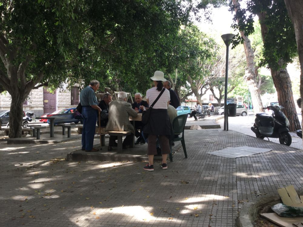 参观一座园艺馆之后,一行四人,我们坐在路边公园般的绿地石凳稍歇,剥血橙,吃枇杷。旁边石桌上,老人们的扑克正酣,朋友凑过去学习,看看他们玩的什么玩意儿。须臾,她回来报告,这些象是退了休的老者们在赌博,精明的朋友只一会儿就看出端倪,弄懂了他们的输赢规则。