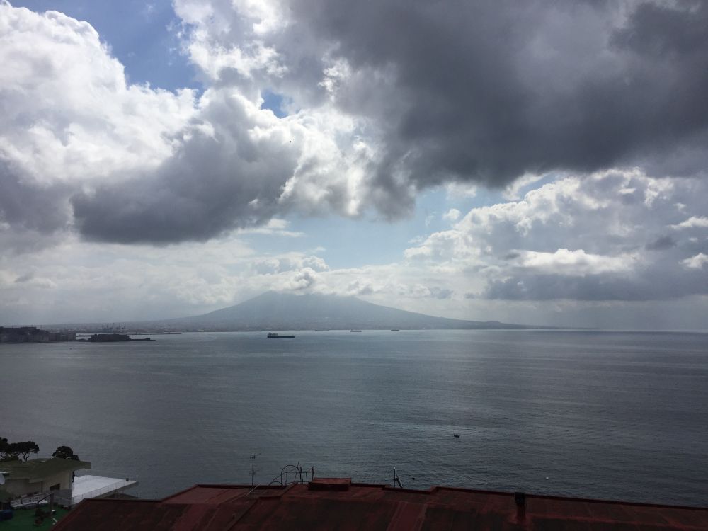 公交车驶过那布勒斯海岸线一代的时候,远处的维苏威火山清晰可见,山间的云雾直上蓝天,分不清是水雾,还是火山的灰烟,反正壮观如火山喷发。