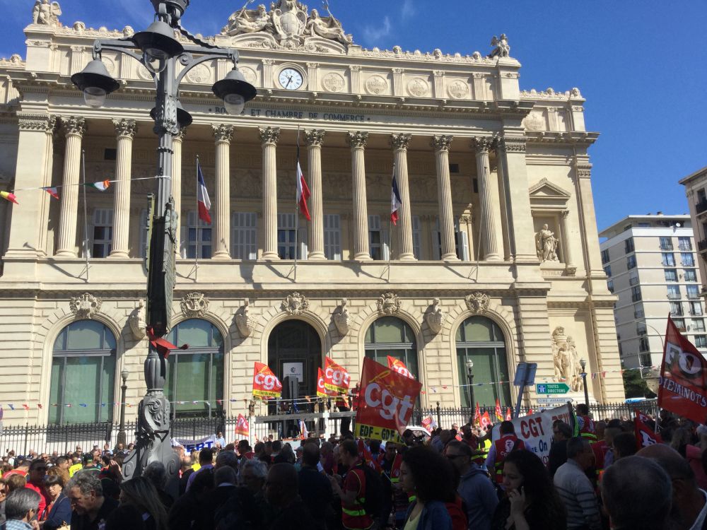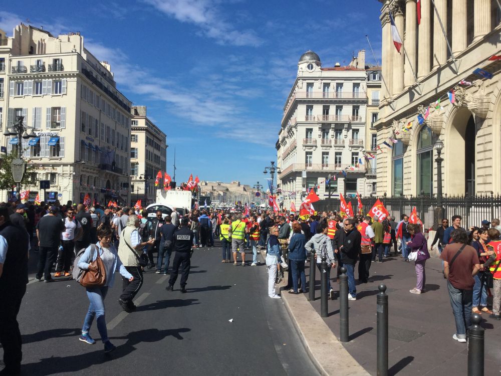 公交车今天是乎出奇的少,我们来到一栋像是政府办公楼门前。这里人头攒动,很多人拿着桔黄色小旗,堵塞了附近几条大街,周围还有不少腰间插着手枪的警察。凭经验一看便知,这些人是在游行示威,后来知道,这天法国总工会发起了全国总罢工,反对政府公布新的劳工法,其实我们不知这仅仅是开始,回国以后从新闻上得知,欧洲的工人工会这阵子特别忙碌,到处都有罢工行动,特别是法国,尤其工人运动的发源地马赛。居然让我们经历过共产主义教育的人等,实际体会工人阶级的力量。
