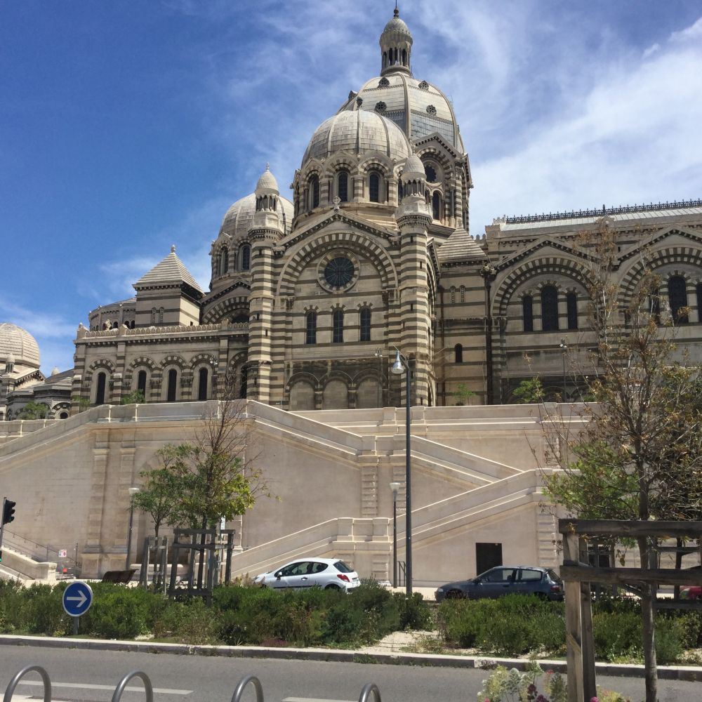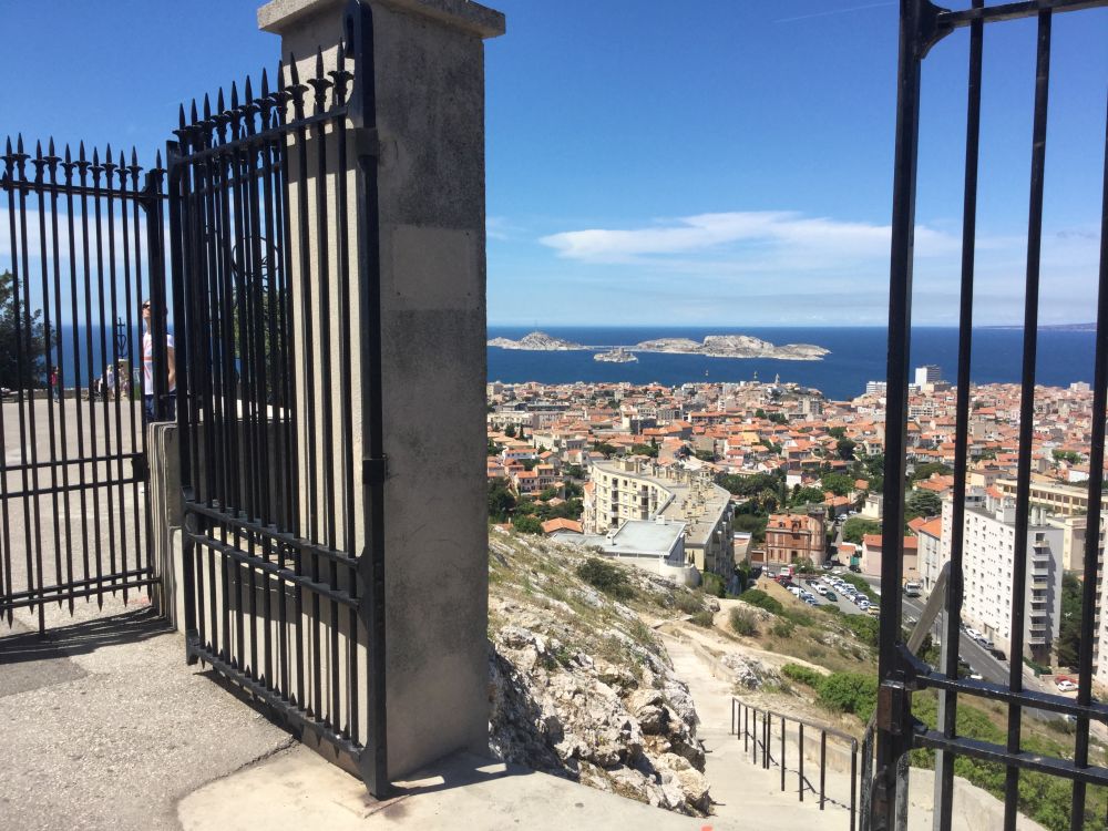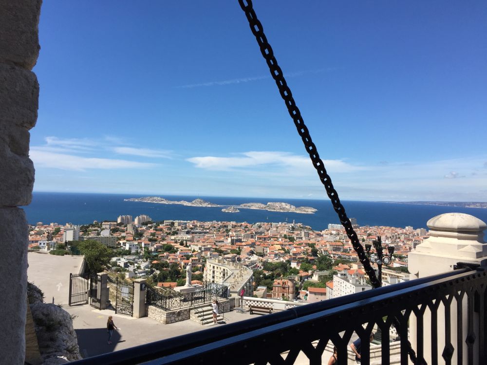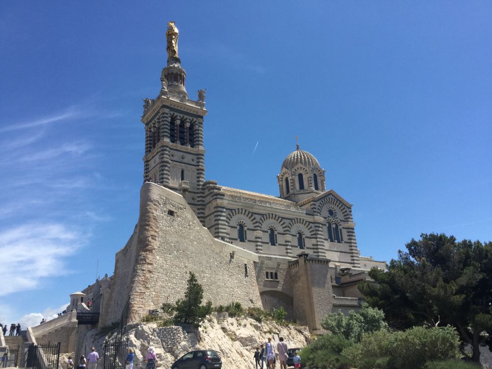 重返渔人码头。经过一段不短的时间等候,我们终于上了一家仍在营运的私家敞篷观光巴士,下个目标即是马赛制高点上的鹿特丹大教堂。大教堂外关气派宏伟,居高临下,马赛内外尽收眼底。从这里可以俯视这个马赛港,也可以清除远眺港外的伊夫堡。教堂内部则非常现代化,小型电梯把高高的教堂分为六楼,有精神就从外面的石级攀登,无力者可乘电梯直达顶峰。