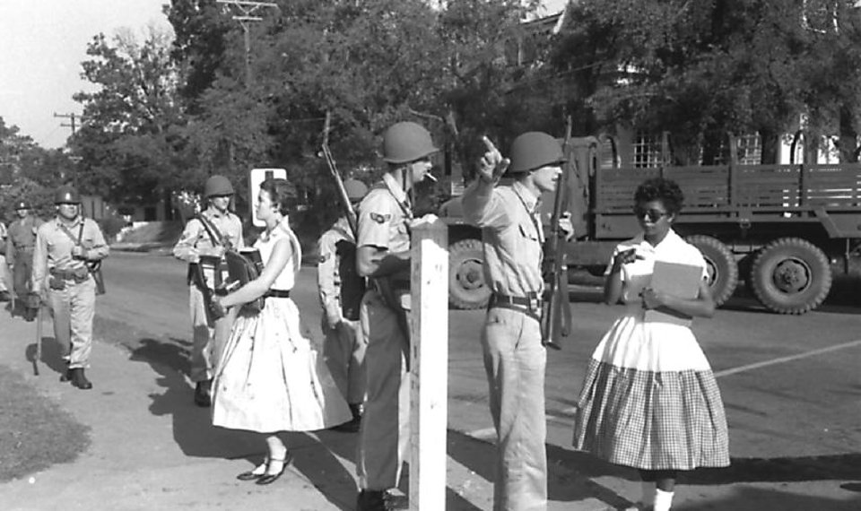 这还了得,阿肯色吃了熊心豹子胆,竟敢抵抗宪法赋予这些学生的权利,时任联邦总统的艾森豪威尔,即令美军第一零一空降师,一千二百名三百二十七空降战斗群士兵奔赴小石城,真枪实弹,全副武装,为学生保驾护航。十名录取的黑人学生,此时又吓跑一名。算了,这阵仗,还是别去遭罪了,结果就有了后来著名的“小石城九”了。