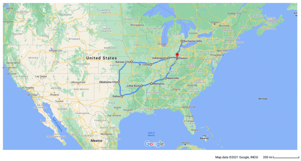 所圈之地囊括俄亥俄、肯塔基、田纳西、阿肯色、德克萨斯、俄克拉荷马、堪萨斯、密苏里、印第安纳。计划驻扎的外州有九个,计划访问的城邑也算世界有名的“大城市”,包括,纳什维尔、孟菲斯、小石城、达拉斯、俄克拉荷马城、堪萨斯城、圣路易斯、印第安纳波利斯、德藤,不多不少,正好也是九个。