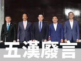 會前,郭柯設局,希望郭、柯、侯上演桃園三結義,怎奈侯友宜帶來馬英九、朱立倫壯膽,五位政壇大佬,台上唇槍舌戰,一派胡言。落得個“五漢廢言”