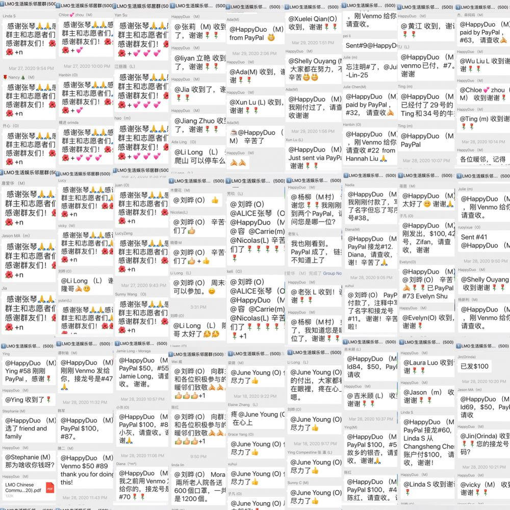 刘晔:@所有人。谢谢happy Duo!辛苦了!感动&感谢暖邻们的爱心参与!目前我们的募款几乎double了我们开始的目标,我准备今晚7:00pm截止募捐接龙。$4100已经交予张琴给社区买口罩,她也同时在看给医护人员用的医用外科口罩和其他防护用品。请看详细账目,Fight against COVID-19
